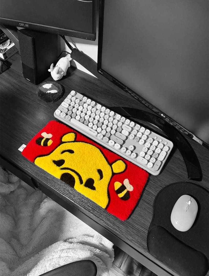 Add a touch of nostalgia and sweetness to your workspace with the Winnie the Pooh-Inspired Keyboard Rug by Mayur Rugs. Perfect for fans of the beloved bear, this handcrafted rug brings cozy charm and playful warmth to your desk setup.